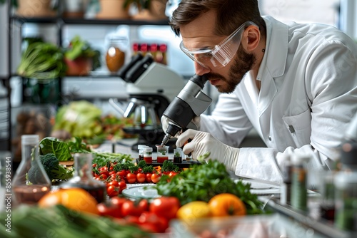 Scientist examining vegetables under microscope
