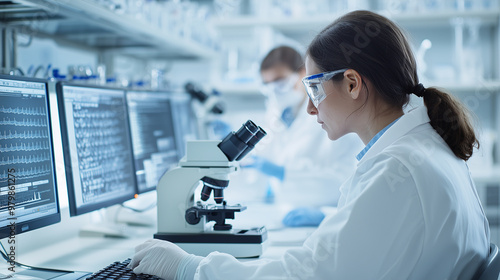 scientist in a state-of-the-art laboratory, focused on analyzing DNA samples using advanced biotechnology equipment. The scene includes a high-resolution microscope, computer scree