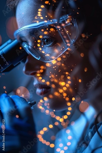 Scientist in protective gear conducts genetic research with microscope and dna helix graphic