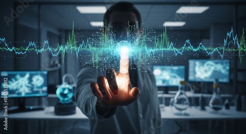 Scientist interacting with holographic data visualization in a modern laboratory setting, analyzing complex information