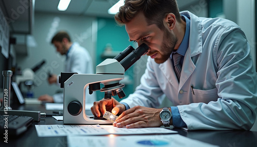 Scientist Using Microscope Examining Electronic Component in Lab