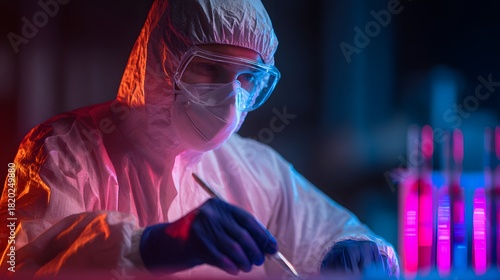 Scientist wearing full protective gear performs detailed work illuminated by dramatic red and blue laboratory lights