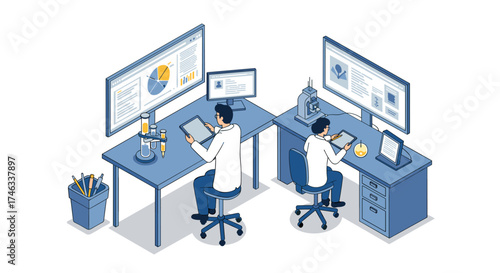 Scientists analyzing data in modern laboratory with digital technology