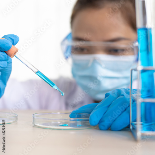 Scientists are carrying blue chemical test tubes to prepare for the determination of chemical composition and biological mass in a scientific laboratory, Scientists and research in the lab Concept.