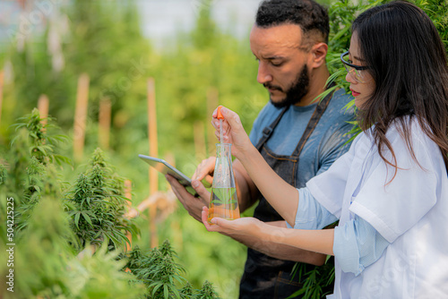 Scientists are investigating and analyzing cannabis experiments. Hold a CBD oil beaker in a greenhouse room.