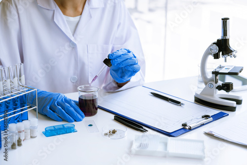 scientists researching in laboratory in white lab coat, gloves analysing, looking at test tubes sample, biotechnology concept