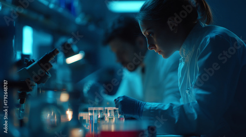 Scientists working in a dark laboratory with microscopes and test tubes under blue light