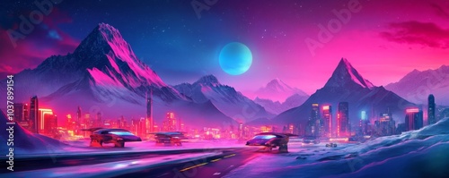 Sci-fi city with alien mountains, advanced transportation, neon-lit streets