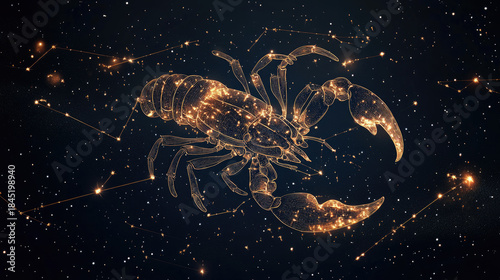 Scorpio zodiac constellation in minimal line art style, thin golden lines forming scorpion shape on dark background, modern mystical astrology design with celestial elements and copy space for text