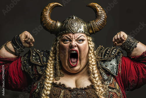 Screaming Viking fat lady with horned helmet