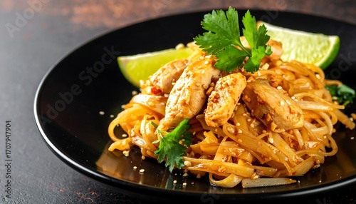 Scrumptious Pad Thai Noodles with Chicken, Lime, and Cilantro in a Bowl