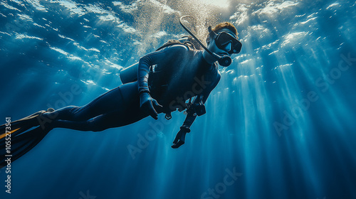 Scuba diver underwater. Side view of scuba diver diving underwater.