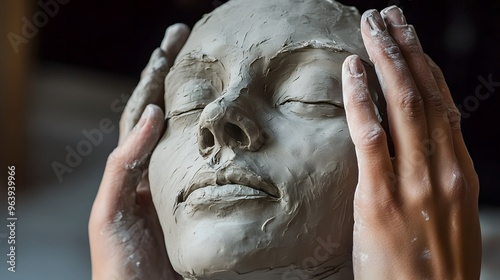 Sculpting a Clay Face: Hands carefully shaping the features of a clay face, focusing on the precision needed to mold eyes, nose, and lips.