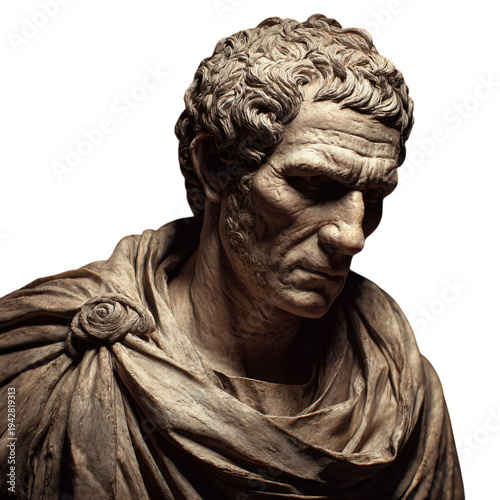 Sculpture of a Roman senator in a toga, deep fabric folds, realistic marble texture, cinematic lighting.