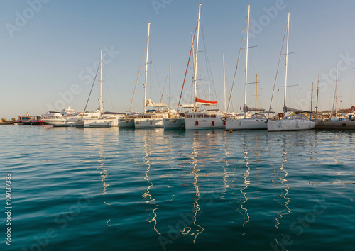 Sea bay with yachts at sunset in Egypt