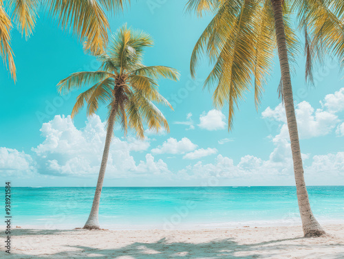 Sea beach in summer with coconut palm tree, blue sky and cloud.