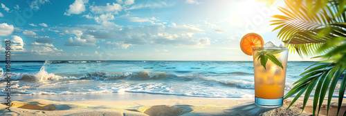 Sea beach with hot sand, palm leaves and cocktail copy space, summer holiday advertising concept