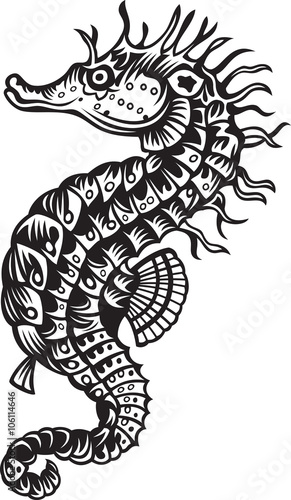Sea horse, black and white vector illustration