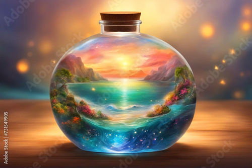 Sea inside a round glass bottle.