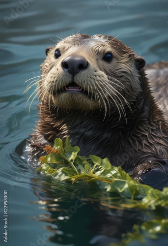 Sea Otter wrapped in kelp floating on water massaging his teeth, floated sea otter, aquatic mammals