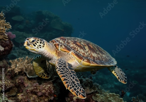 Sea turtle swimming over coral reef underwater