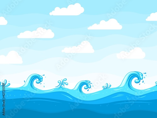 Sea waves background. Ocean wave pattern, water surface or beach landscape. Cartoon sky white clouds, blue splashes recent vector illustration