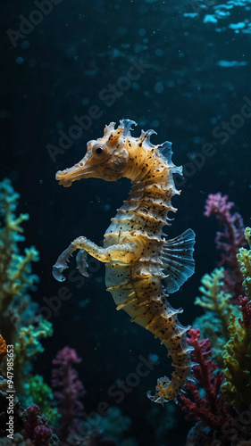 seahorses drifting gracefully in the deep underwater background