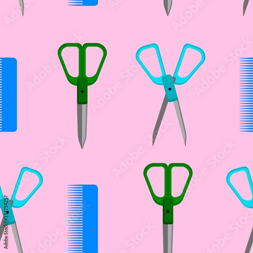 Seamless background, scissors and comb. Vector illustration flat design.