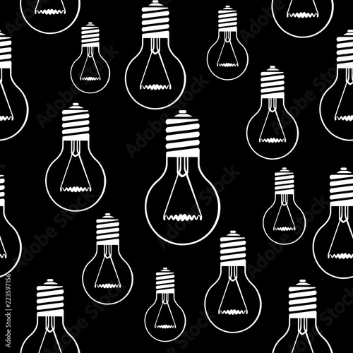 Seamless black vector pattern with white light bulbs.