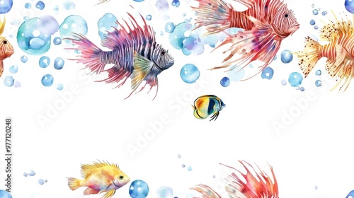 Seamless border of fish bubbles Watercolor illustration of underwater life on a white background featuring colorful lionfish butterfly fish and golden antias in an aquarium setting Aquarelle style
