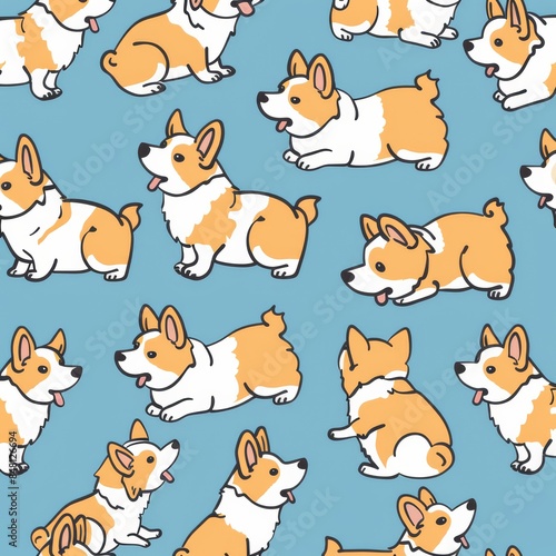 Seamless doodle style different posts corgis background, cute, simple illustration