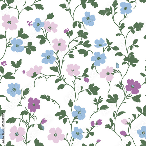 Seamless Floral Pattern with Pastel Blue, Purple, and Pink Flowers on Green Leaves