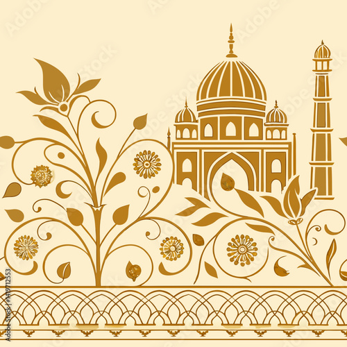 Seamless floral vector pattern with architectural elements in gold