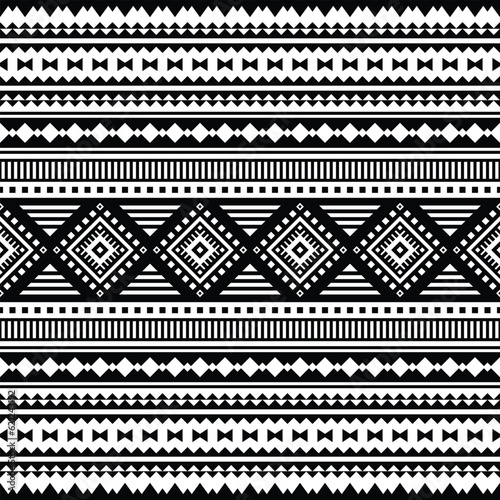 Seamless geometric backdrop with tribal Aztec and Navajo motifs. Ethnic contemporary pattern. Black and white colors. Design for template, fabric, weave, cover, carpet, tile, accessory.
