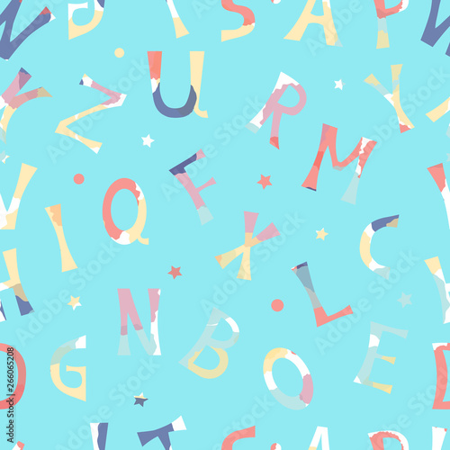 Seamless modern pattern in bright colors with letters. For decoration, invitation on kid celebrate, fabric, textile and linen print, web page background, gift and wrapping paper.