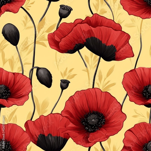 Seamless Pattern - Vibrant red poppies on a pale yellow background.