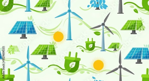 Seamless Pattern Depicting Renewable Energy Sources: Solar Panels and Wind Turbines for