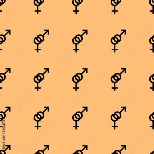 Seamless pattern. Female and male romantic collection. Female and male black small signs same sizes. Pattern on orange background. Vector illustration