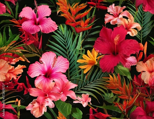 Seamless pattern flora pink Oleander,red Heliconia rostrata, Colorful