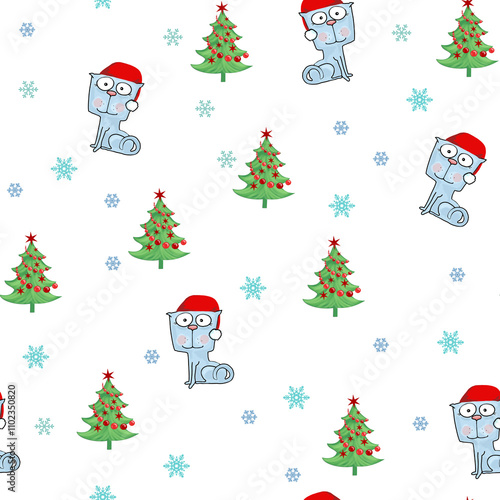 seamless pattern illustration with cats in santas hat and green christmas tree
