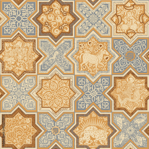 Seamless pattern in the form of oriental tiles. Mosaic with drawings in the style of old Ottoman art.