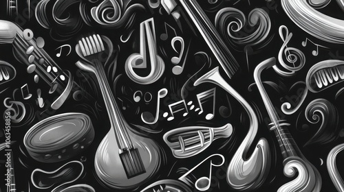 Seamless pattern of musical notes and instruments in a dynamic and artistic composition