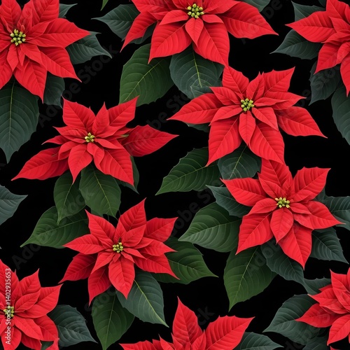Seamless Pattern of Red Poinsettia Flowers on Black Background
