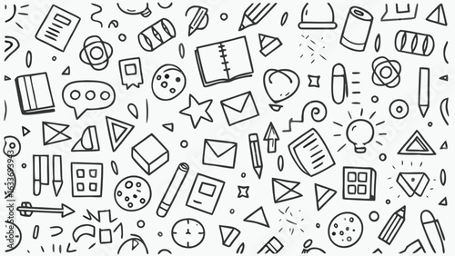 Seamless pattern of school supplies and office stationery in doodle style black outline on white background