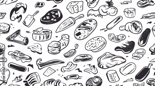 Seamless pattern of various cuts of meat and grilling tools, perfect for restaurant menus or butcher shop branding