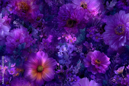 Seamless pattern of Vibrant purple floral arrangement showcasing diverse flowers in a lush garden setting during springtime