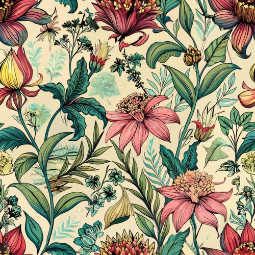 Seamless pattern of Victorian-era botanical illustrations arranged in a repeating design, Generative AI