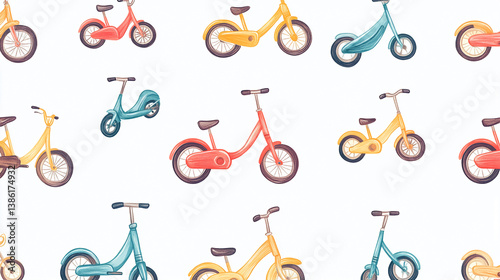 Seamless pattern of watercolor balance bikes and scooters for kids children transport design art 100