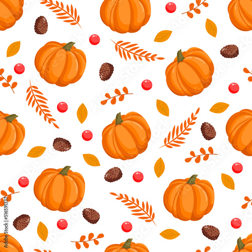 Seamless pattern with autumn pumpkins, leaves, fir cones and red berries. October harvest. Thanksgiving and Halloween. Vector illustration for fabrics, textures, wallpapers, posters, cards.
