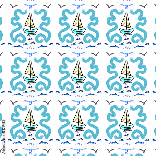 seamless pattern with blue flowers,sailboat,bird